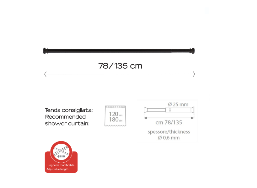 Asta alluminio estensibile 78/135 – ø 25 spessore mm 0,6. Si consiglia l'uso di tende doccia da 120 e 180 cm
