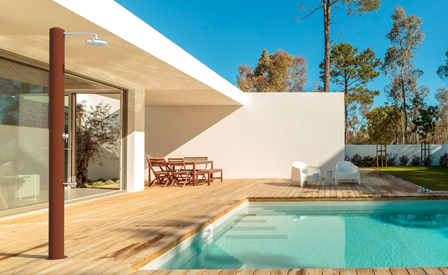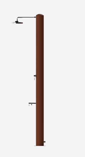 Tevere è indubbiamente il modello passe-partout della linea Gocce. Compatta, dal design minimalista, si adatta perfettamente a tutti gli ambienti e necessita di pochissimo spazio per l’installazione. Si compone di un tubo solare in acciaio inox con verniciatura color Corten. Le parti idrauliche, realizzate in metallo nobile, sono opportunamente studiate e trattate per uso esterno. Tra queste, l’innovativo soffione con morbidi ugelli gommati che rendono semplicissima e veloce l’eliminazione del calcare, allungando sensibilmente il ciclo di vita del componente. Il soffione a risparmio energetico “eco rain”, grazie a particolari fessure situate nella griglia della doccia, miscela l’aria all’acqua, fornendo un getto potente ed efficace ed impiegando una minore quantità d’acqua. In una giornata soleggiata, Tevere regalerà fino al calar della sera il piacere dell’avvolgente tepore dell’acqua, riscaldata dai raggi solari.
