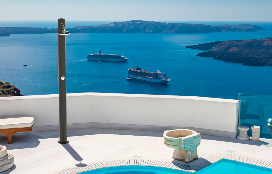 Tevere è indubbiamente il modello passe-partout della linea Gocce. Compatta, dal design minimalista, si adatta perfettamente a tutti gli ambienti e necessita di pochissimo spazio per l’installazione. Si compone di un tubo solare in acciaio inox con verniciatura nero opaco. Le parti idrauliche, realizzate in metallo nobile, sono opportunamente studiate e trattate per uso esterno. Tra queste, l’innovativo soffione con morbidi ugelli gommati che rendono semplicissima e veloce l’eliminazione del calcare, allungando sensibilmente il ciclo di vita del componente. Il soffione a risparmio energetico “eco rain”, grazie a particolari fessure situate nella griglia della doccia, miscela l’aria all’acqua, fornendo un getto potente ed efficace ed impiegando una minore quantità d’acqua. In una giornata soleggiata, Tevere regalerà fino al calar della sera il piacere dell’avvolgente tepore dell’acqua, riscaldata dai raggi solari.