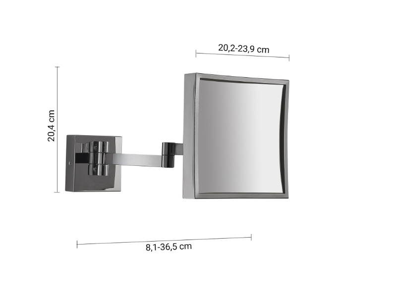 Specchio "Maya" cromato da parete ingranditore e non, bifacciale. Fattore ingrandimento 5x MATERIALE acciaio inox aisi 304, ottone, cromall®, vetro MISURE TECNICHE 20,2- 23,9 X 8,1 X 36,5 MAX X 20,4