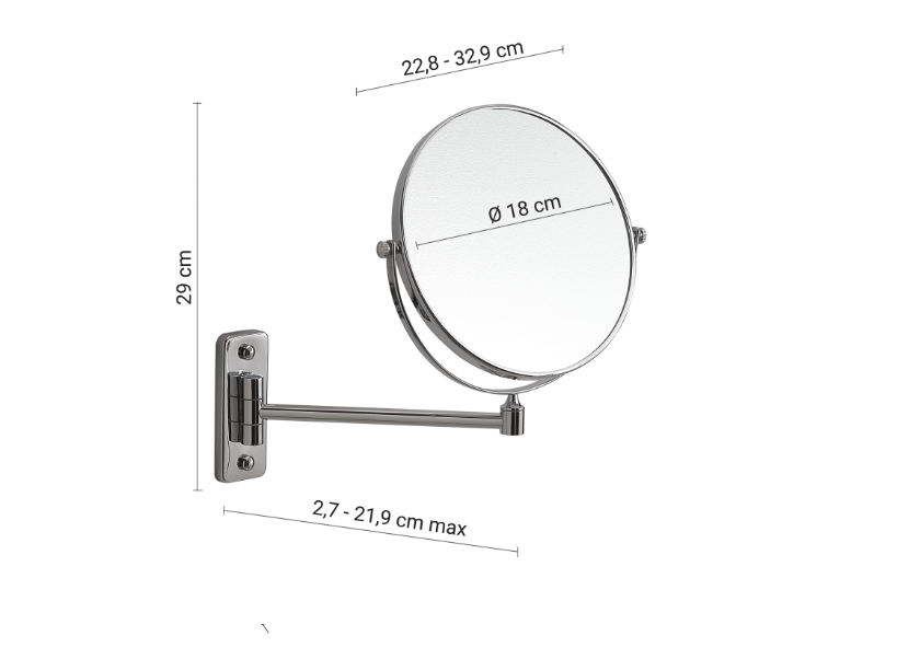 Specchio "Mia" cromato da parete ingranditore e non, bifacciale. Fattore ingrandimento 3x MATERIALE acciaio inox aisi 304, ottone, cromall®, vetroMISURE TECNICHE 22,8-32,9 X2,7-21,9 X 29